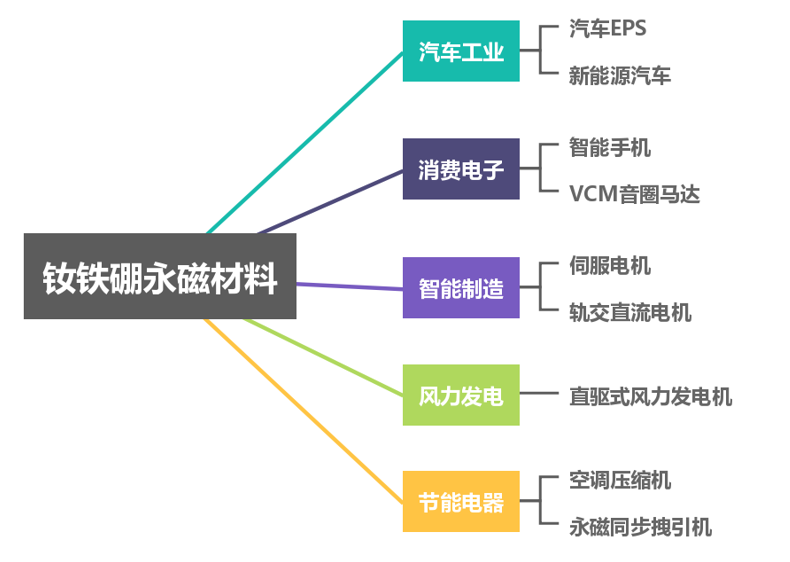 钕铁硼(Nd-Fe-B)永磁材料已经诞生三十余载,凭借高的矫顽力、高的(BH)(室温下通常大于30MGOe)和高的性价比,广泛应用于永磁直驱风力发电机组、新能源汽车驱动电机及EPS(电子转向系统)、ABS(防抱死制动系统)等汽车零部件、各类家电压缩机、电梯曳引机以及工业机器人用伺服电机等领域。